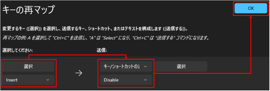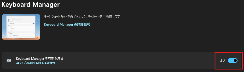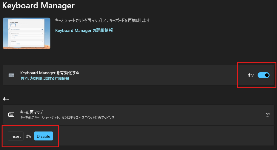 PowerToysのインストールが終わりましたら、「Keyboard Mnanager」で「insertキー」を無効化します。